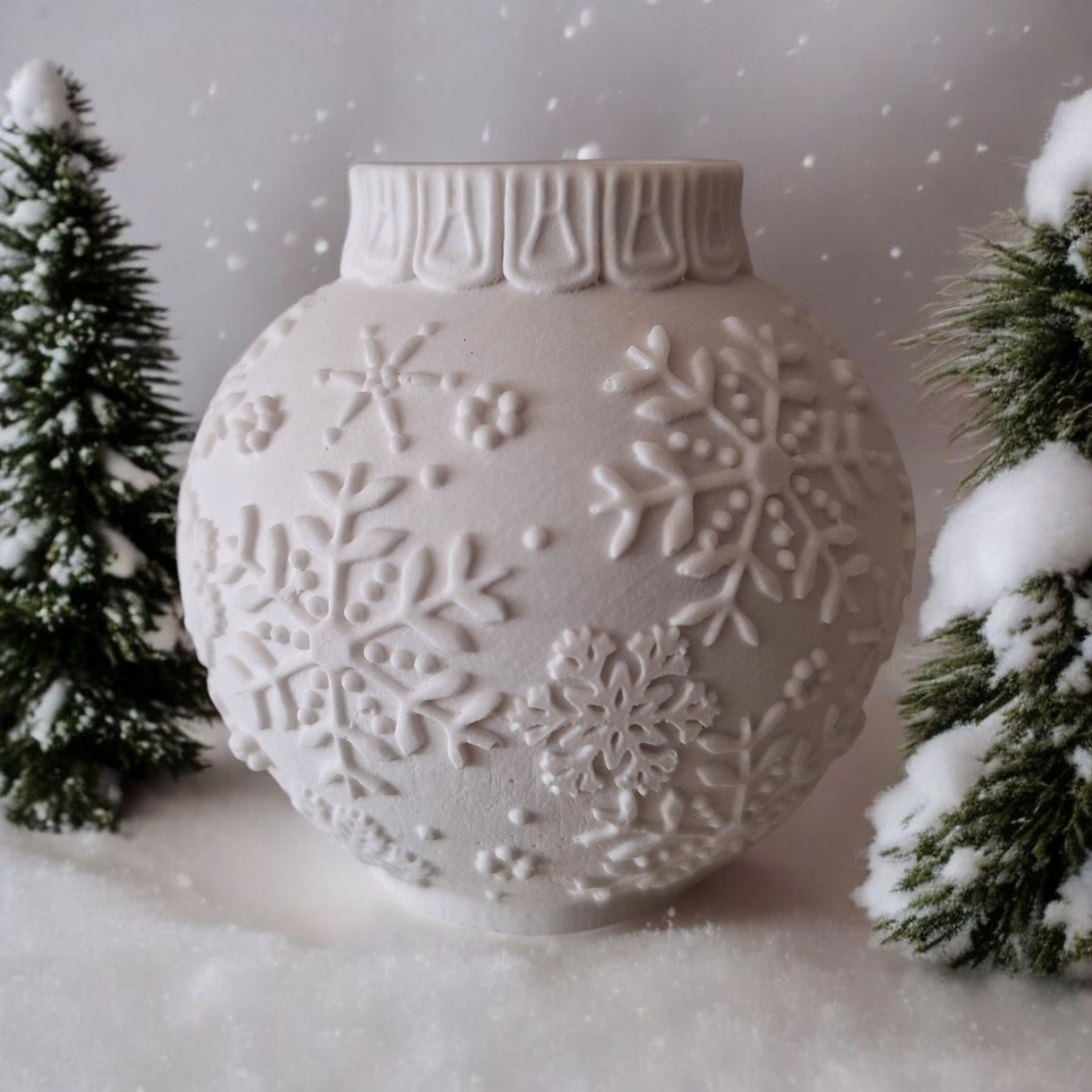 Het ontwerp combineert de klassieke vorm van een kerstbal met een verfijnde sneeuwvlokstructuur in reliëf, waardoor hij een stijlvolle en winterse uitstraling heeft.