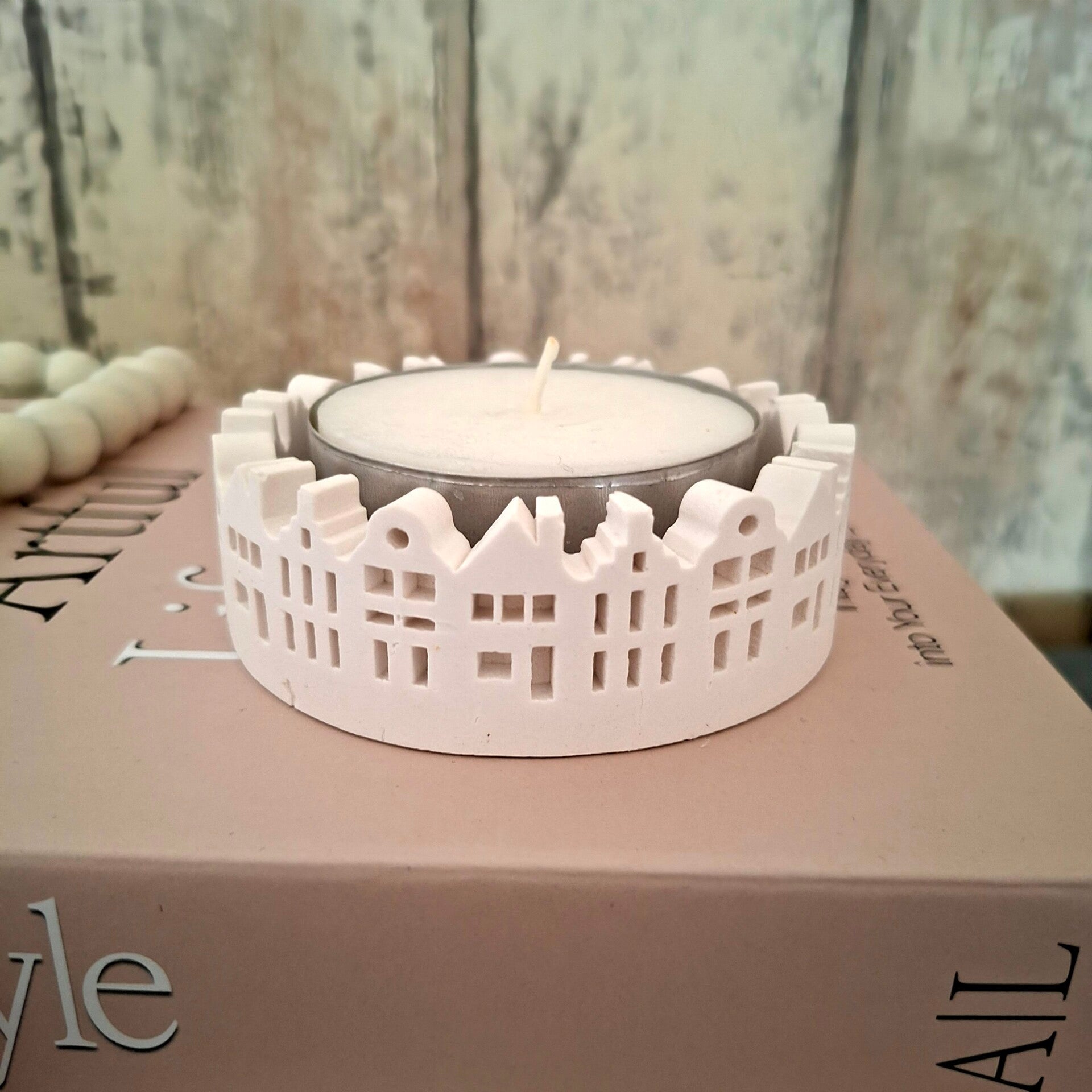 Deze waxinelichthouder is geschikt voor een groot theelicht en staat prachtig op tafel, in de vensterbank of op een dressoir. Door het tijdloze ontwerp met huisjes past hij moeiteloos in verschillende interieurstijlen zoals landelijk, Scandinavisch en modern.